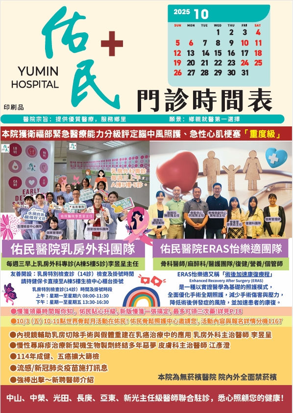 佑民醫院2025年10月份門診時刻表公告
