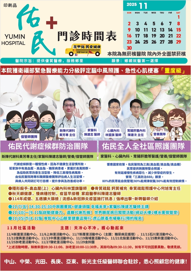 佑民醫院2025年11月份門診時刻表公告
