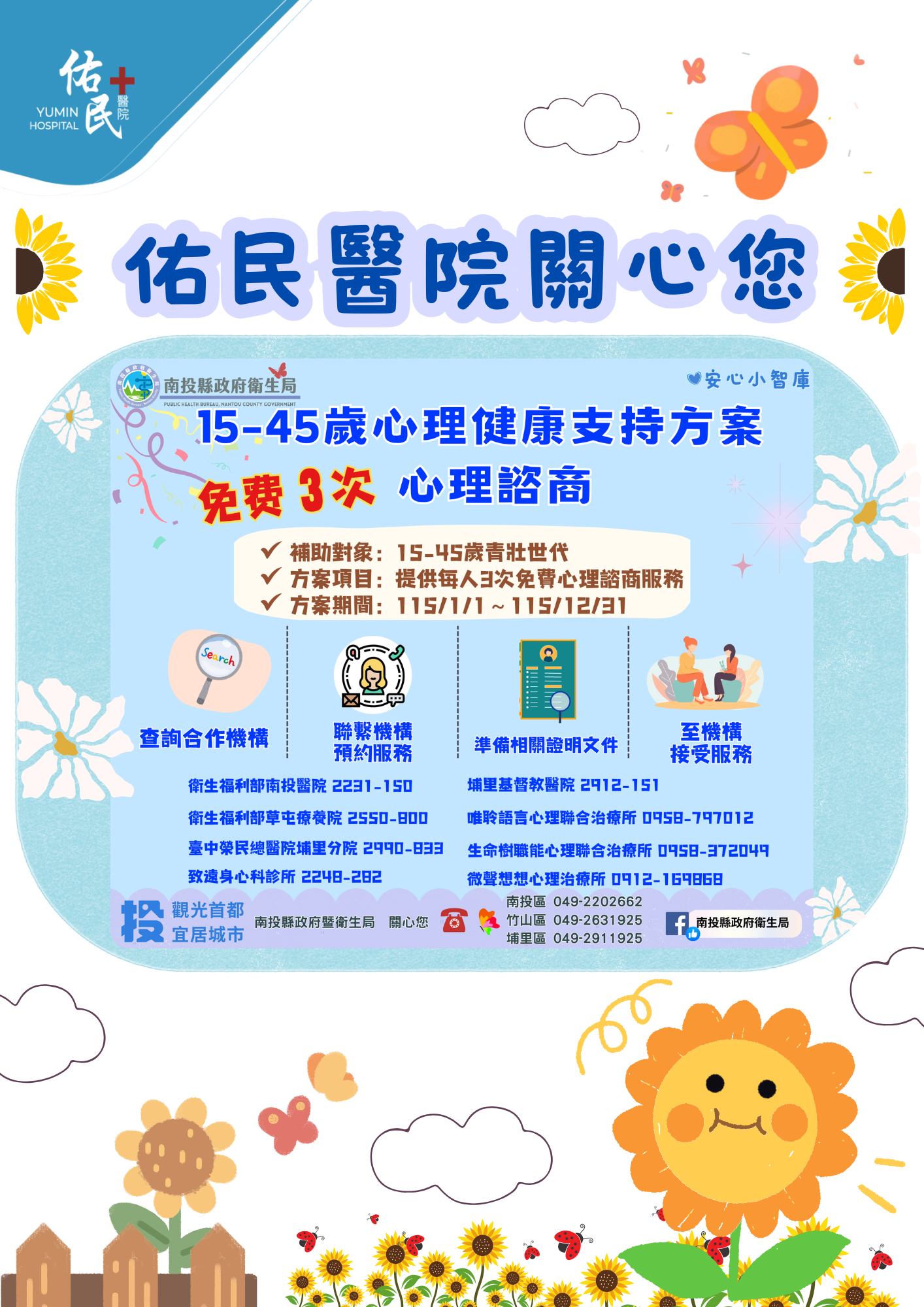 💙【佑民好關心 |15-45 歲心理健康支持方案|免費 3 次心理諮商】💙